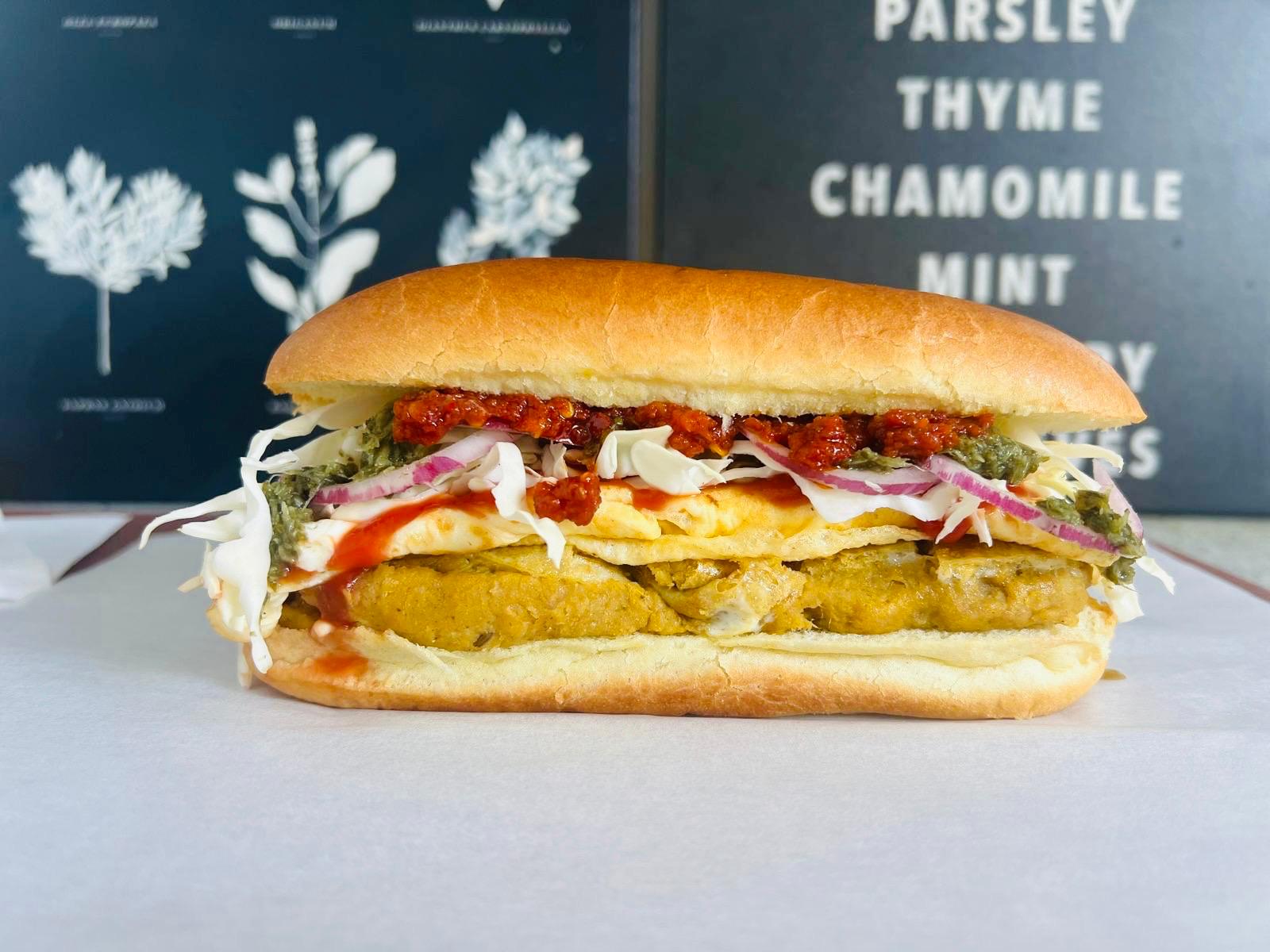 Soft veggie patty blended with spiced split chickpea lentils, crisp salad, mint chutney, all in a soft bun . A true spicy desi flavour explosion.